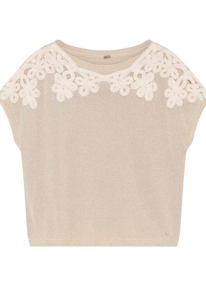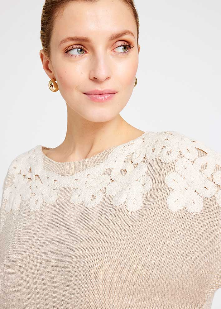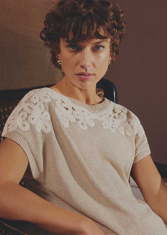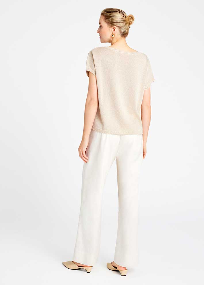 Vakker gyllen/sandfarget Odessa-strikkbluse med diskret glitter fra Gustav. Blusen har et enkelt, helsnitt og er dekorert med det vakreste broderiet øverst. En virkelig elegant strikk som er enkel å kombinere med f.eks. lette bukser, langt skjørt eller jeans. Her vist med Bavisha-bukser og Miya-bukser.