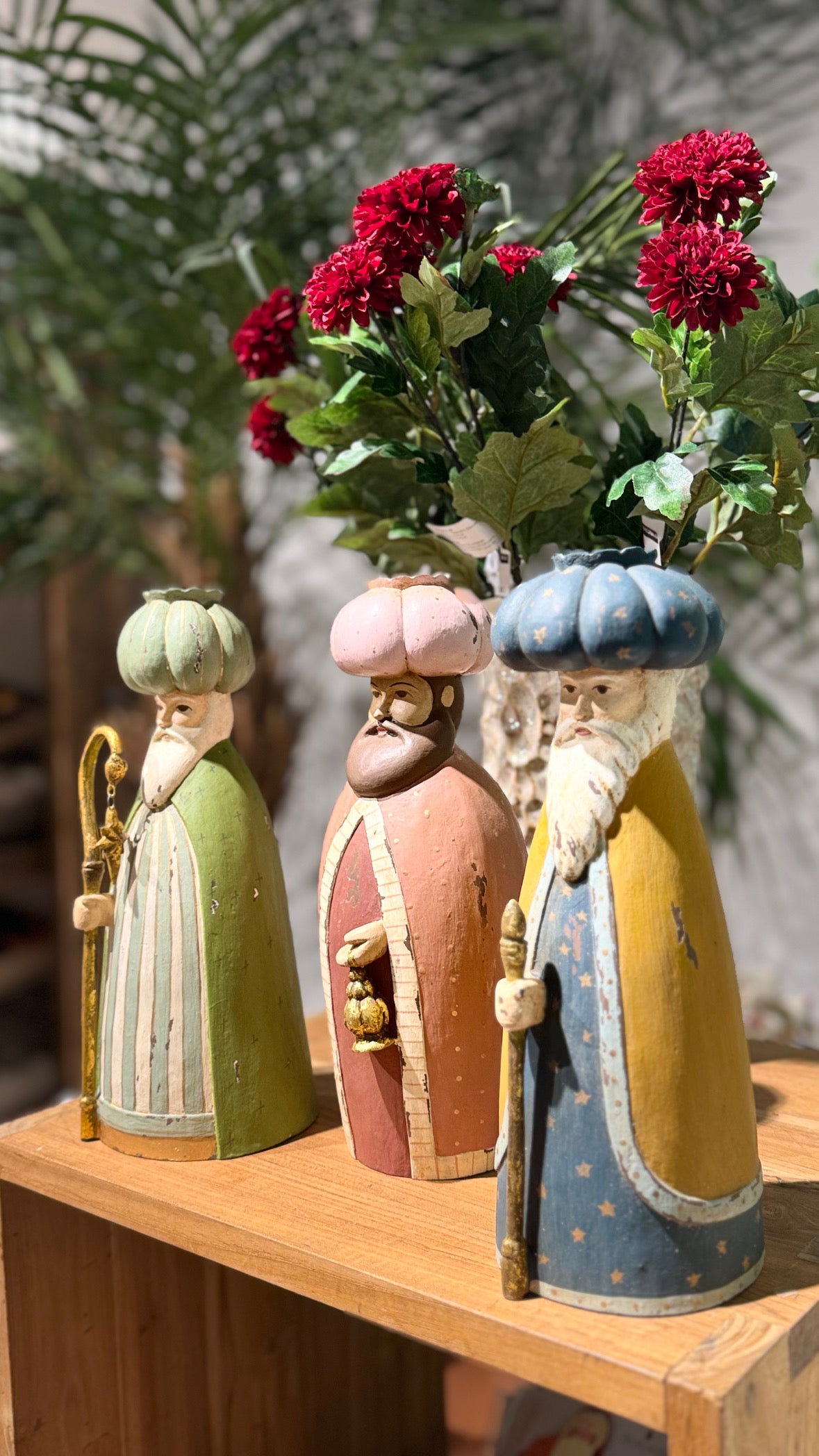 Melchior, Kaspar og Balthasar følger stjernen på sin reise mot Betlehem, bærende hvert sitt lys for å hilse på det nyfødte Jesusbarnet. I deres hender bærer de håpets flammer, som skinner klart i mørket, og leder dem trygt gjennom natten. Figurene symboliserer tro, visdom og en reise mot lys og kjærlighet.