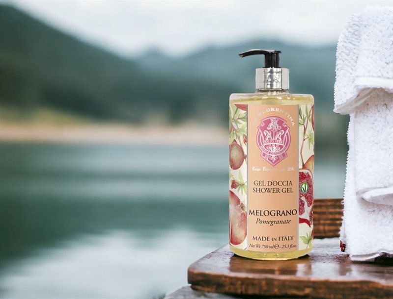 Dusjgele med et fuktighetsgivende og rensende mykt skum. Inneholder blant annet olivenolje, naturlige ekstrakter og en nydelig duft av granatepler. Et elegant tillegg til badet eller kjøkkenvasken. En nydelig duft av Toscana.
