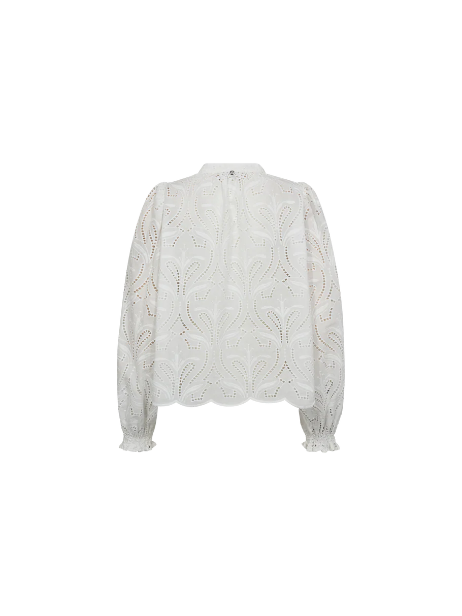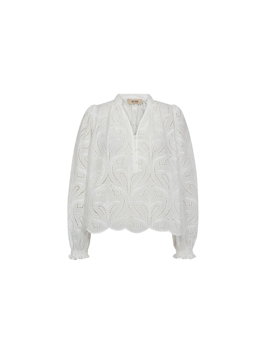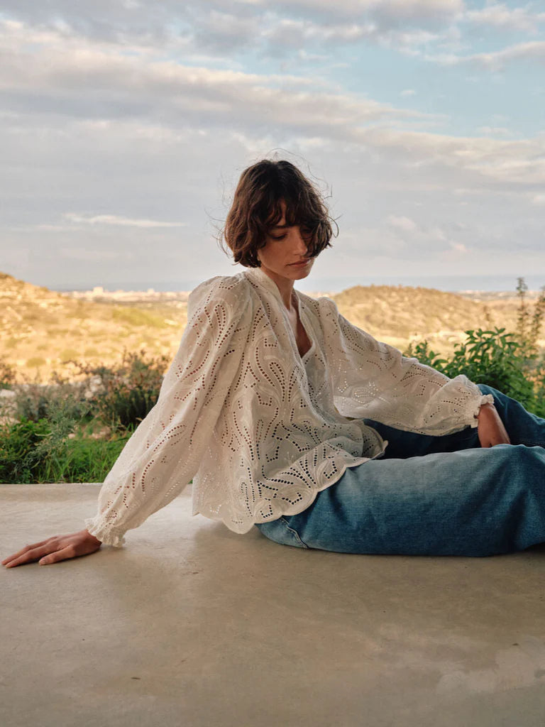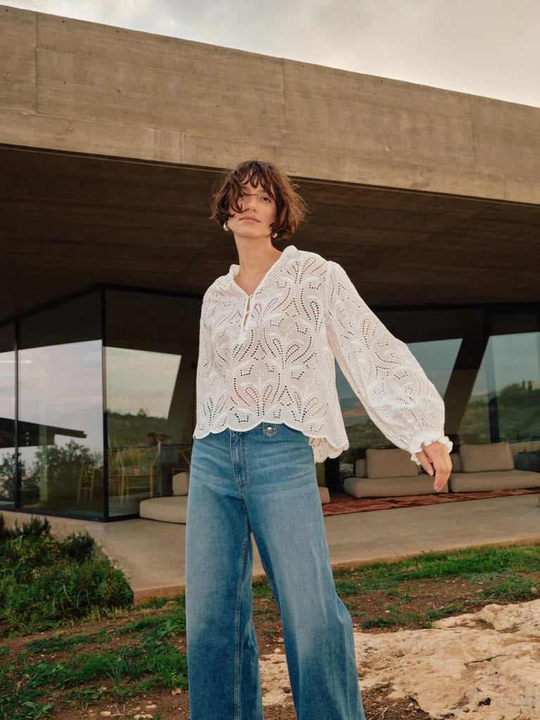 Denne blusen, utsmykket med delikat heldekkende broderi anglaise, utstråler eleganse og sjarm. Designet i en avslappet silhuett, tilbyr den både komfort og uanstrengt stil. Den halvknappede stolpen gir et snev av avslappet sofistikasjon, mens de voluminøse ermene med vaffelmansjetter skaper et romantisk preg. Den har en kamskjellkant som gjør den til et iøynefallende plagg for styling i varmt vær. Kombiner den med flagrende bukser for et luftig, uanstrengt sommerantrekk som utstråler tidløs sofistikasjon.