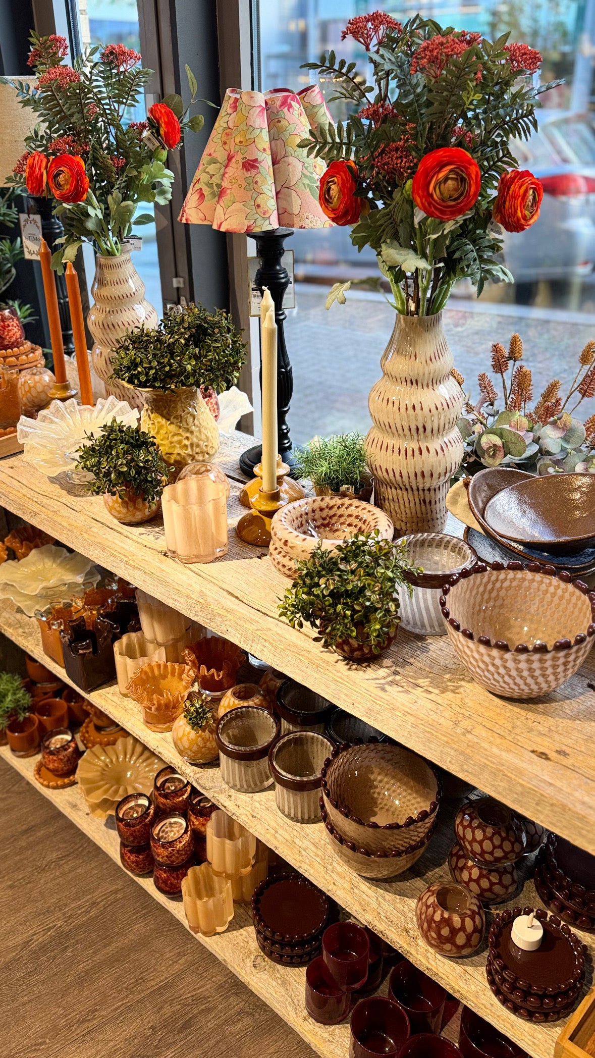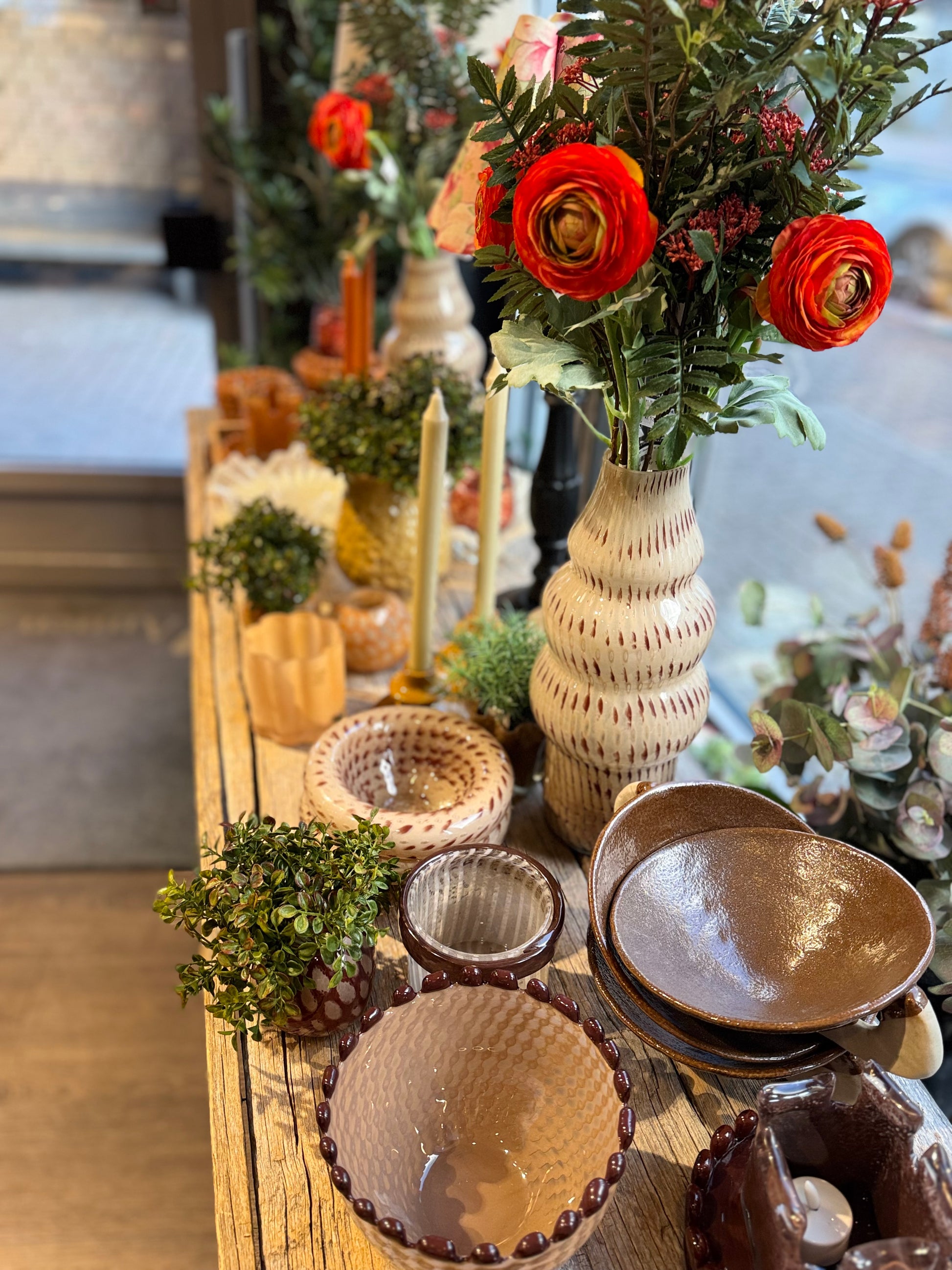 Håndlaget bolle med vakkert design i varme, jordnære toner. Perfekt både som dekorativ detalj og serveringsskål.