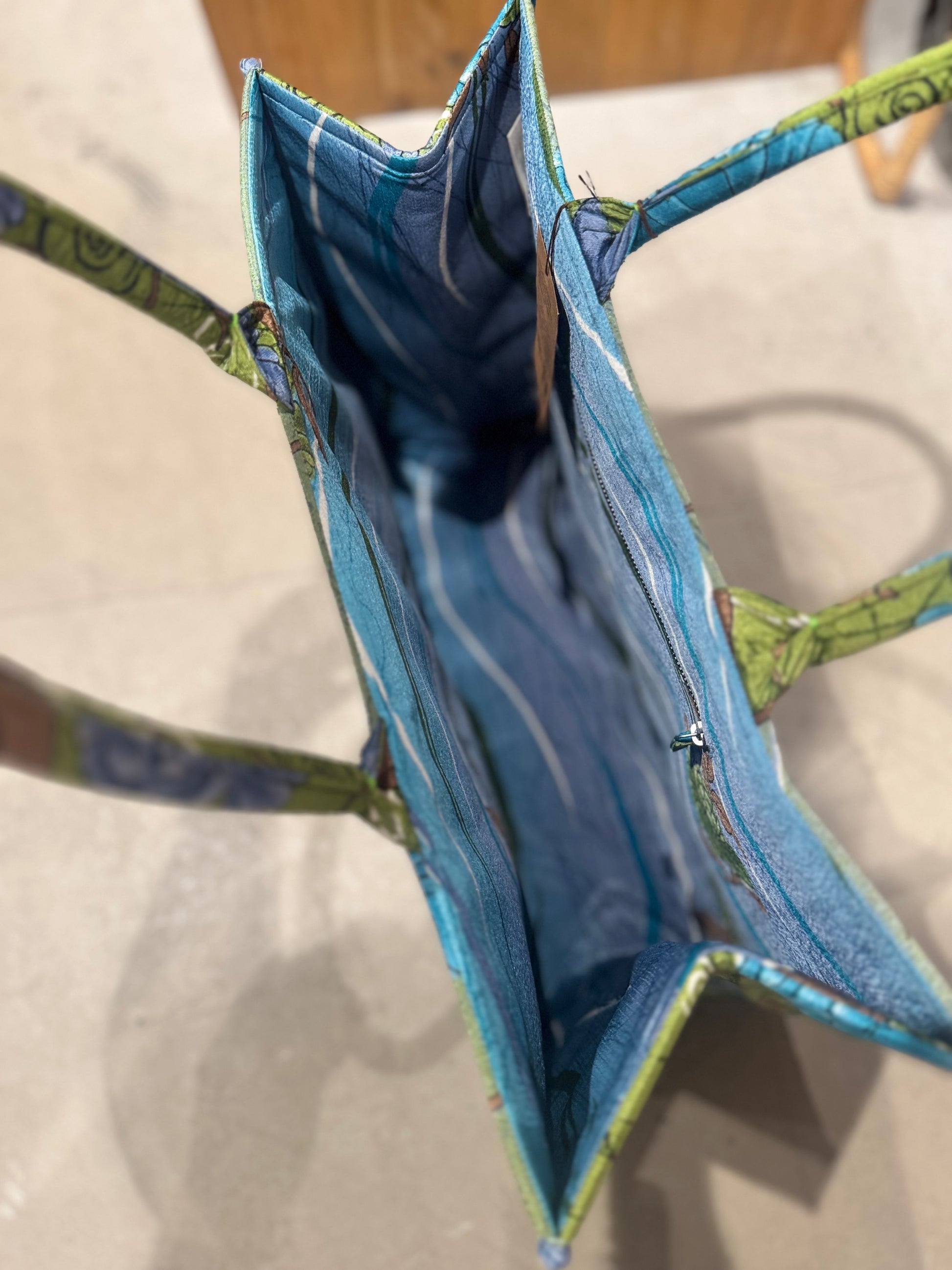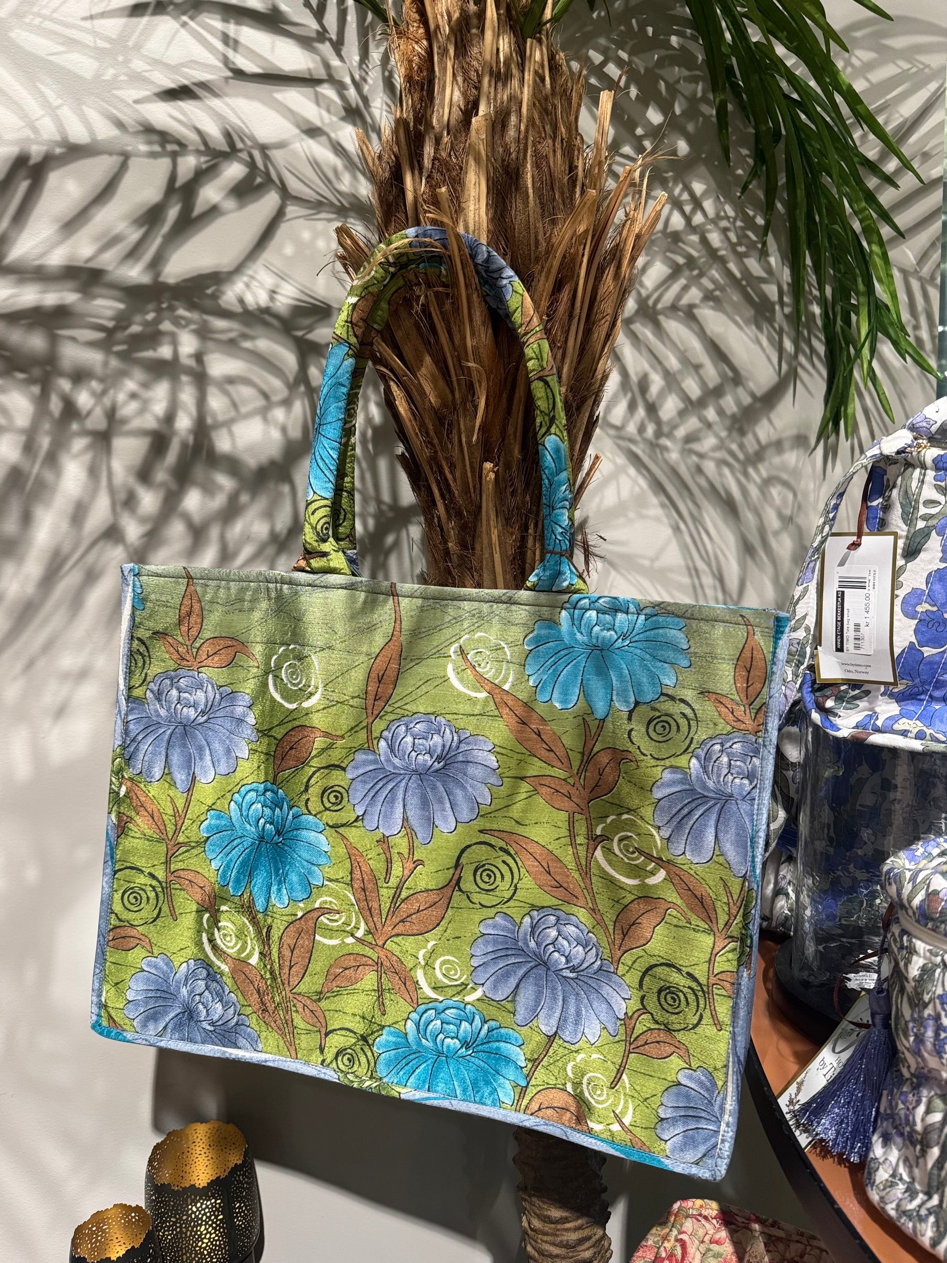 Våre vatterte handlevesker kommer i myke teksturer og livlige farger som fungerer sammen med det spesialutvalgte innerfôret. En sikker kandidat til å bli en av dine favorittvesker – på kontoret, til shopping og happy hour, samtidig som de alltid setter et stilig preg. Hver veske har en positiv sosial og miljømessig innvirkning. Alle produktene våre er laget av brukte sarier, som bidrar til å bevare planeten vår i møte med katastrofer. Størrelse – bredde: 38 cm, lengde: 41 cm, håndtaksavstand: 27 cm. Belysning og skjermer kan forårsake små variasjoner i fargeutseende.