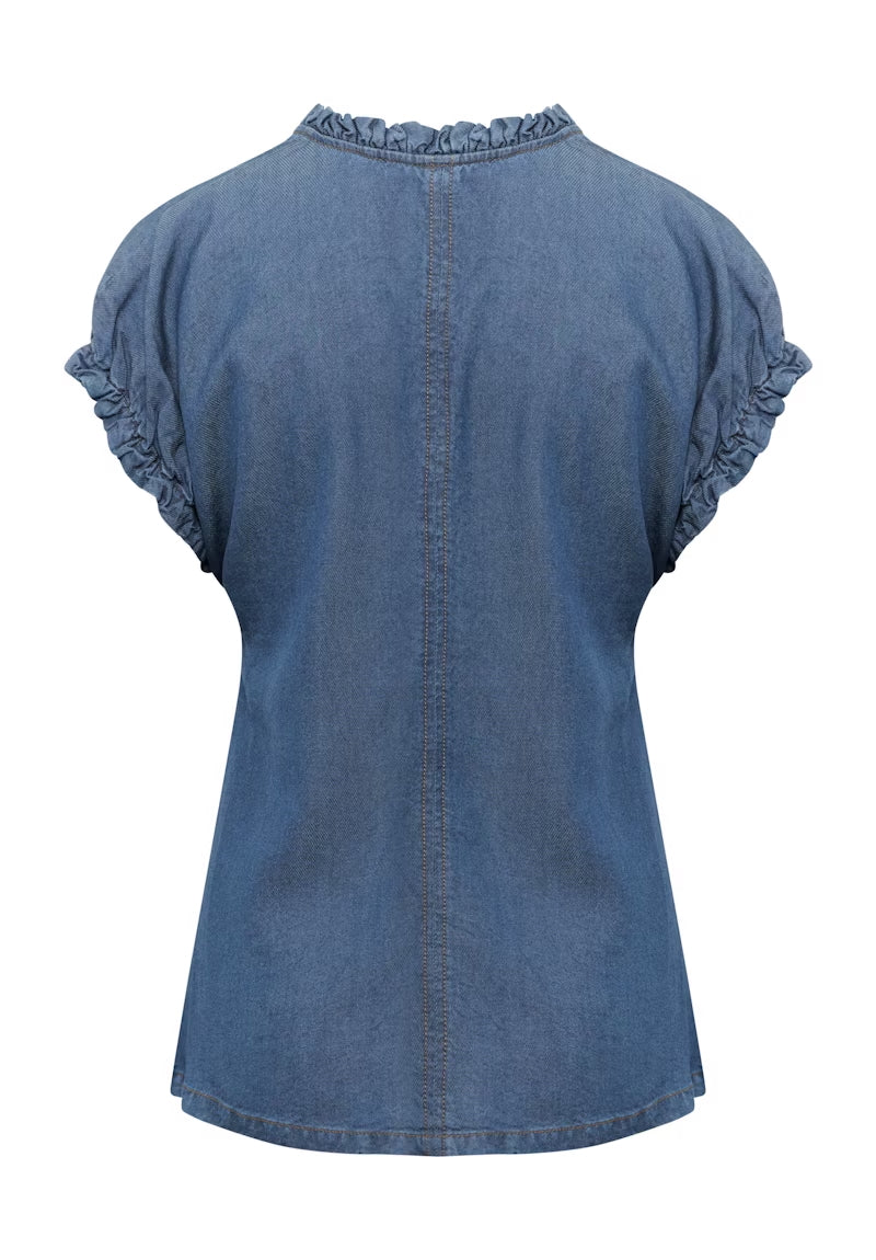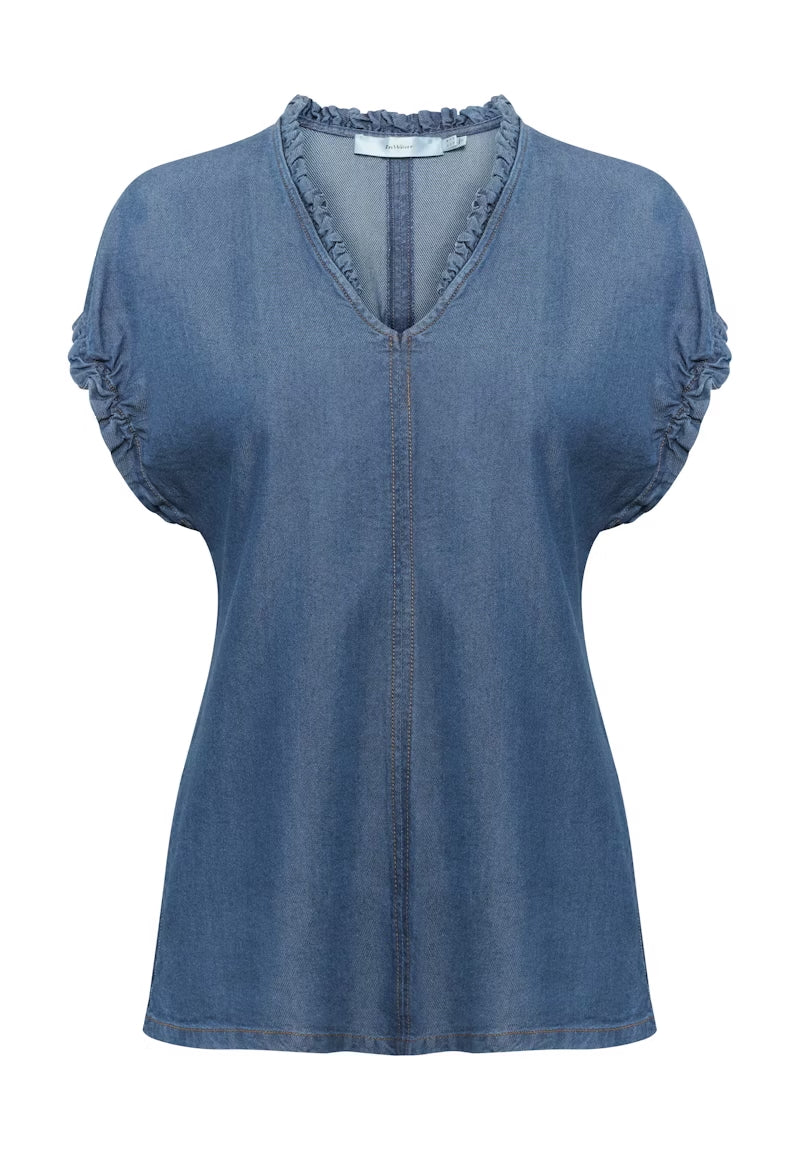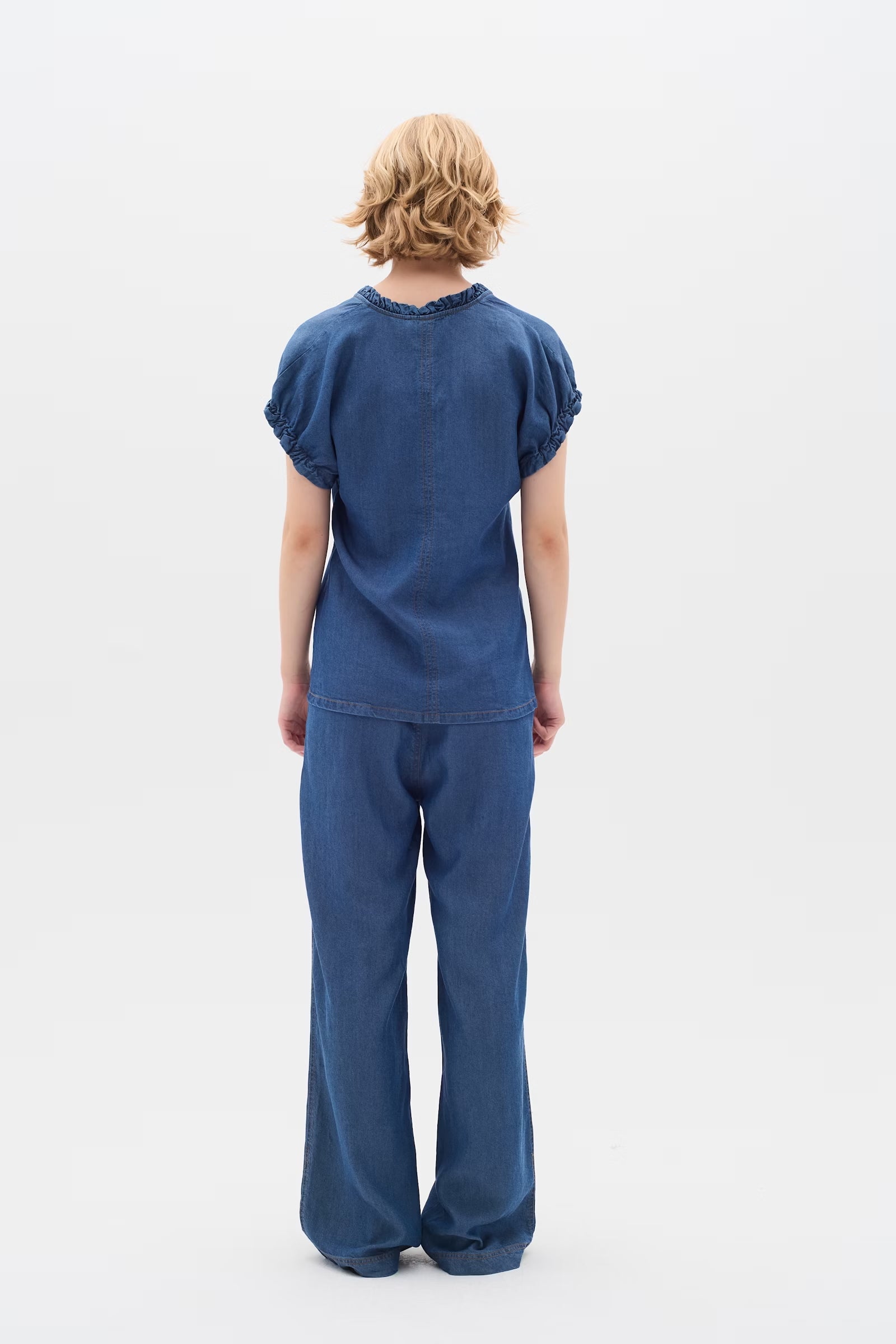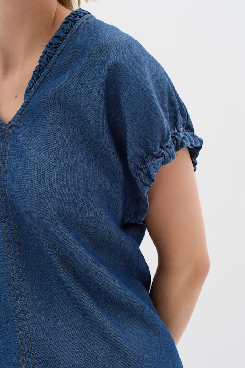 Bluse i myk, vasket denim i en dyp blå farge. Modellen har V-utringning med dekorativ kant, korte ermer med rynk og en avslappet passform. En lett og behagelig topp med feminine detaljer. Modellen er 176 cm høy og har på størrelse 36/S.
