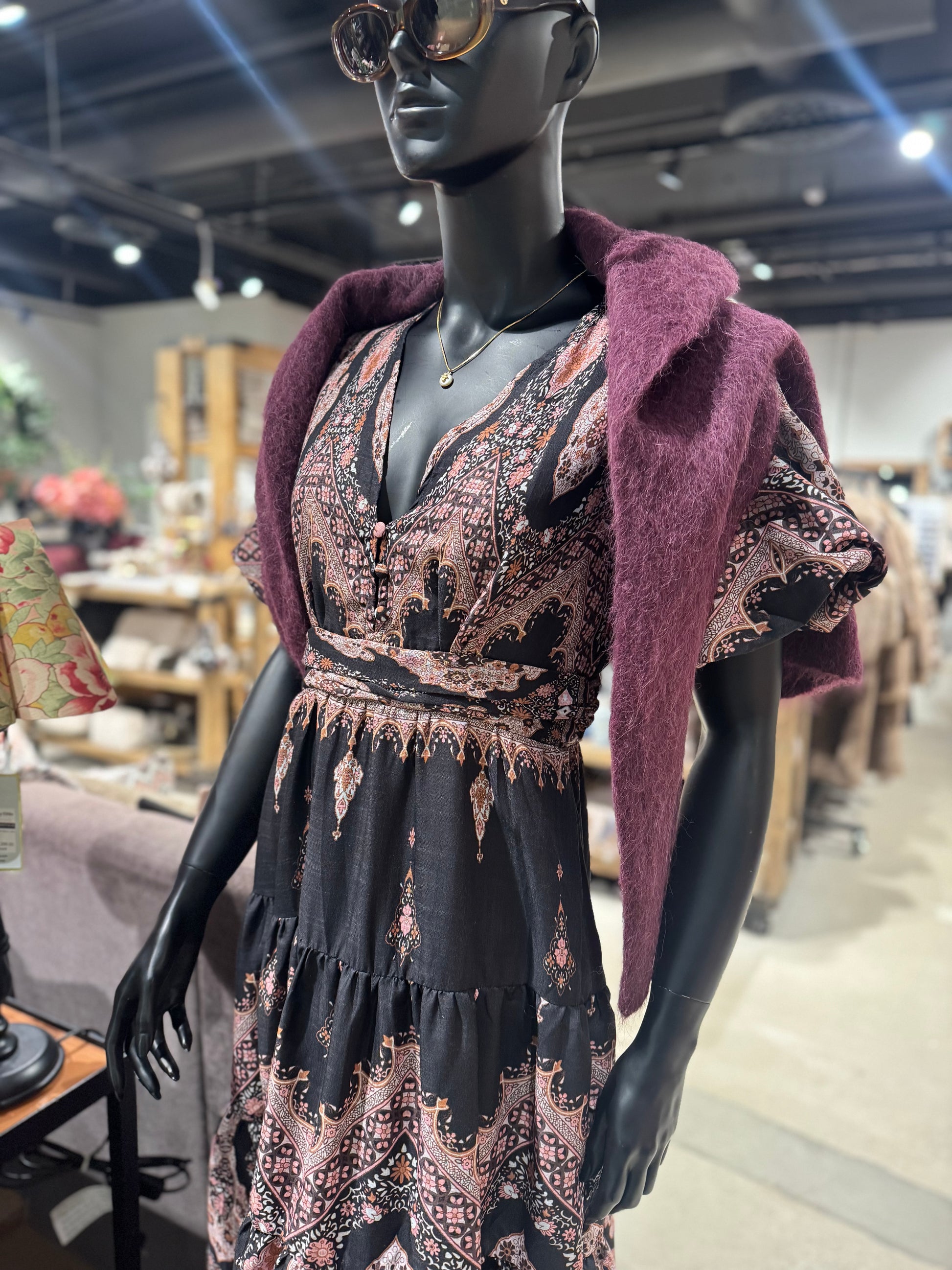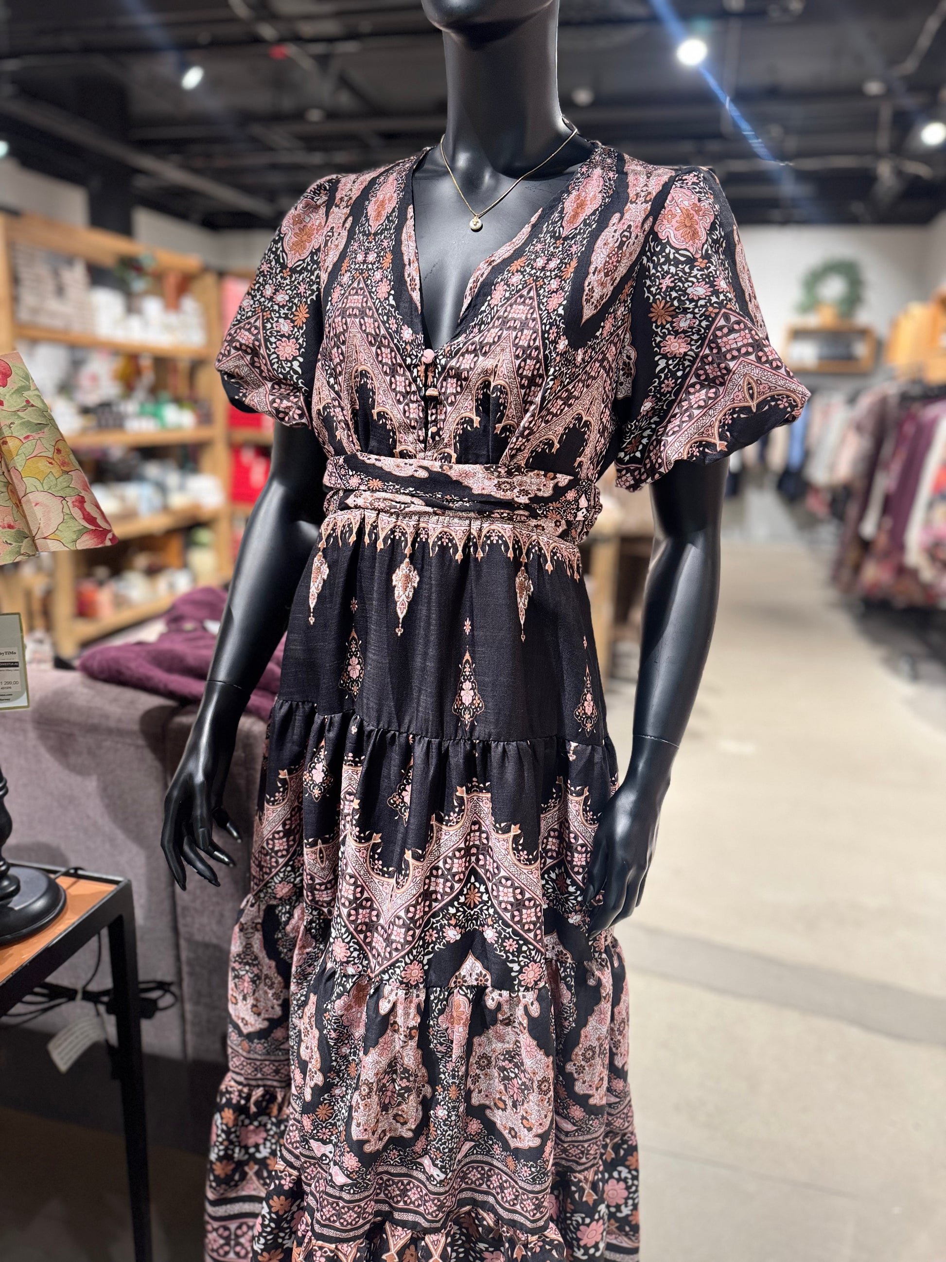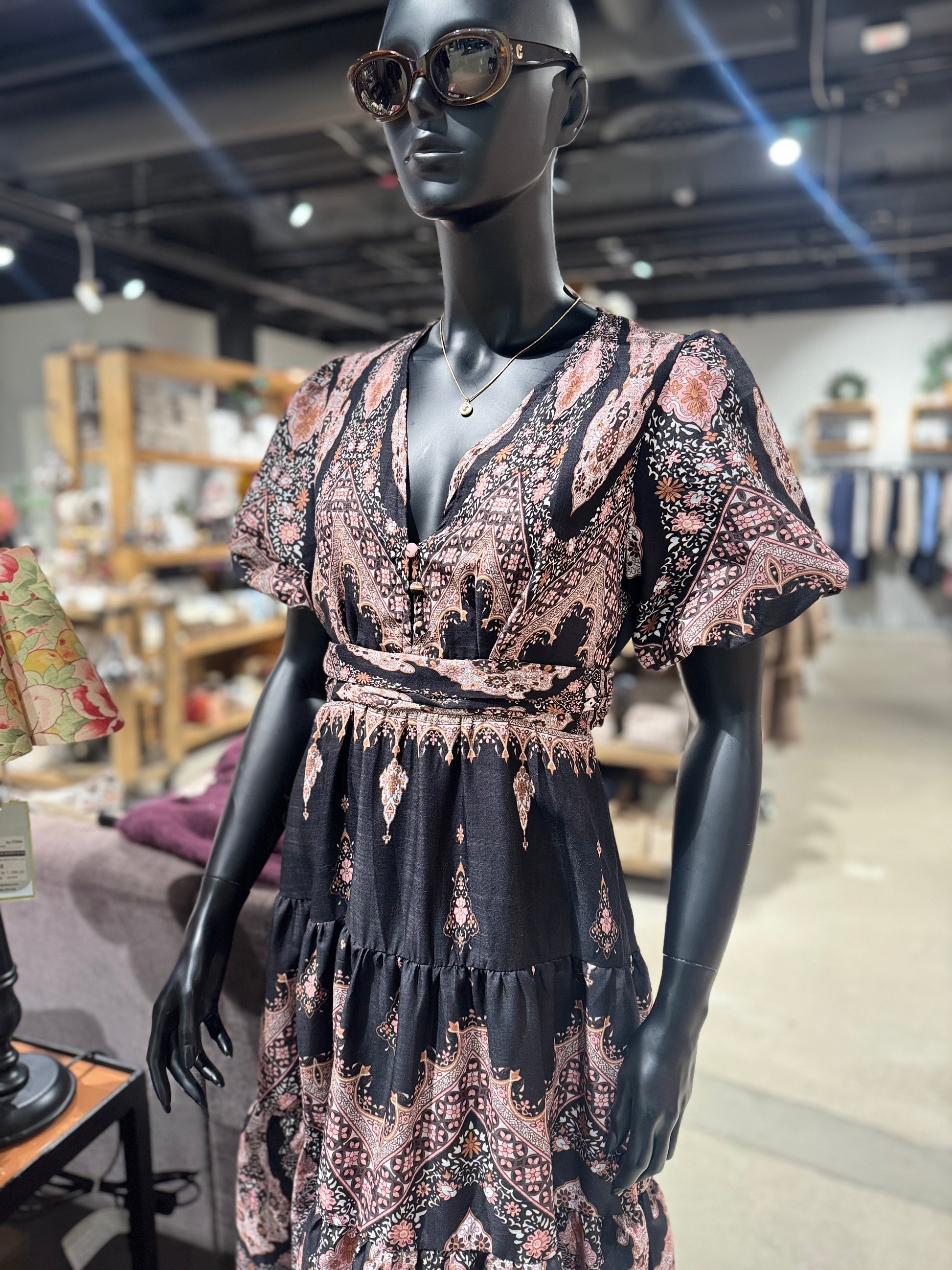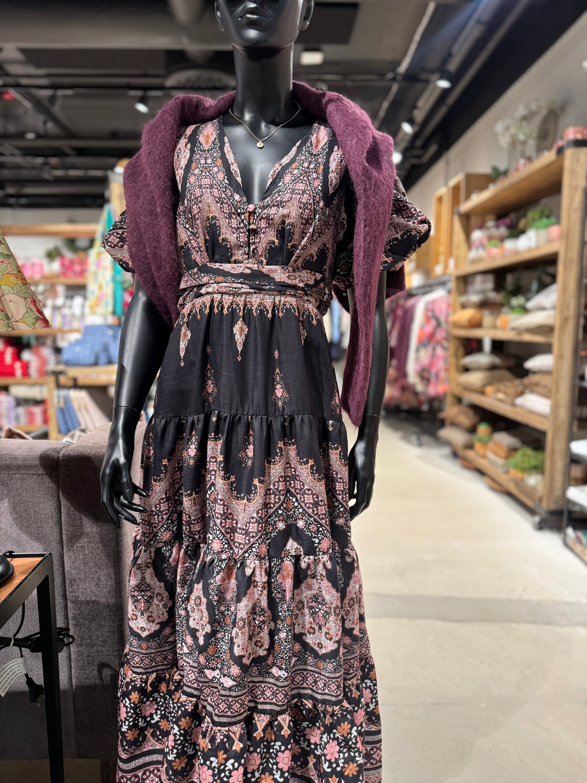 Elegant kjole med nydelig print fra Paris. Kjolen har en god lengde i tillegg til vide ermer med strikk og puff på skuldrene. Den har et bredt belte i midjen og knappelukking i front med flere ulike ulike motiver! Lommer er det også på kjolen som er genialt!