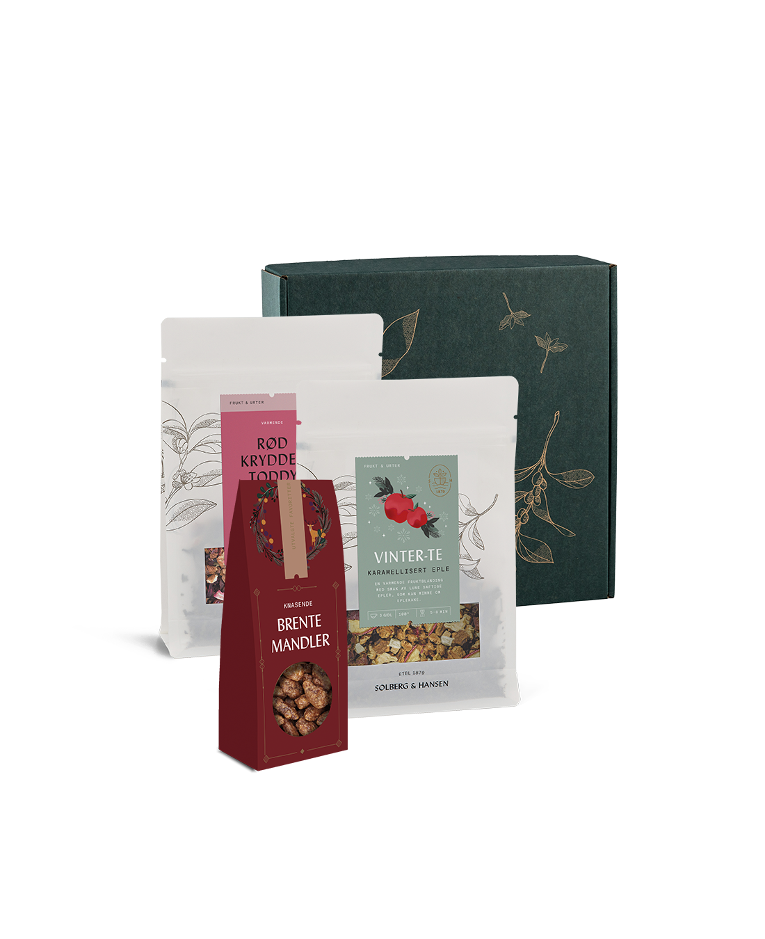 En komplett gavepakke med to ulike teer og brente mandler. Leveres ferdigpakket i en fin grønn eske.